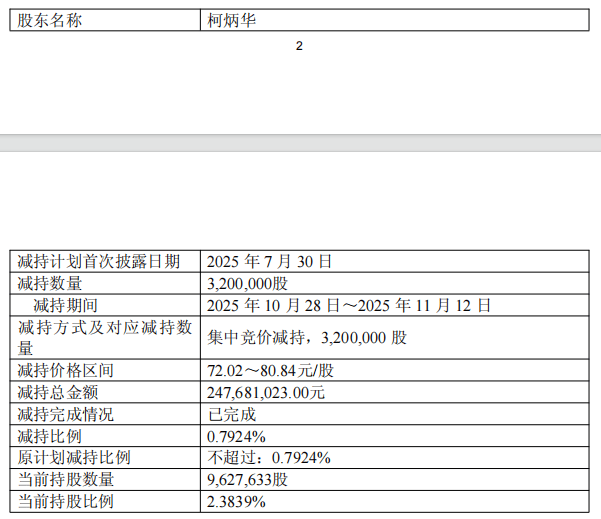 近日,公司收到柯炳华发来的《告知函》。截至2025年11月12日,柯炳华通过集中竞价交易方式减持股份3,200,000股,占公司总股本比例为0.7924%。本次减持计划已实施完毕。柯炳华本次减持期间为2025年10月28日至11月12日,减持价格区间为72.02元/股至80.84元/股,减持总金额为247,681,023.00元。