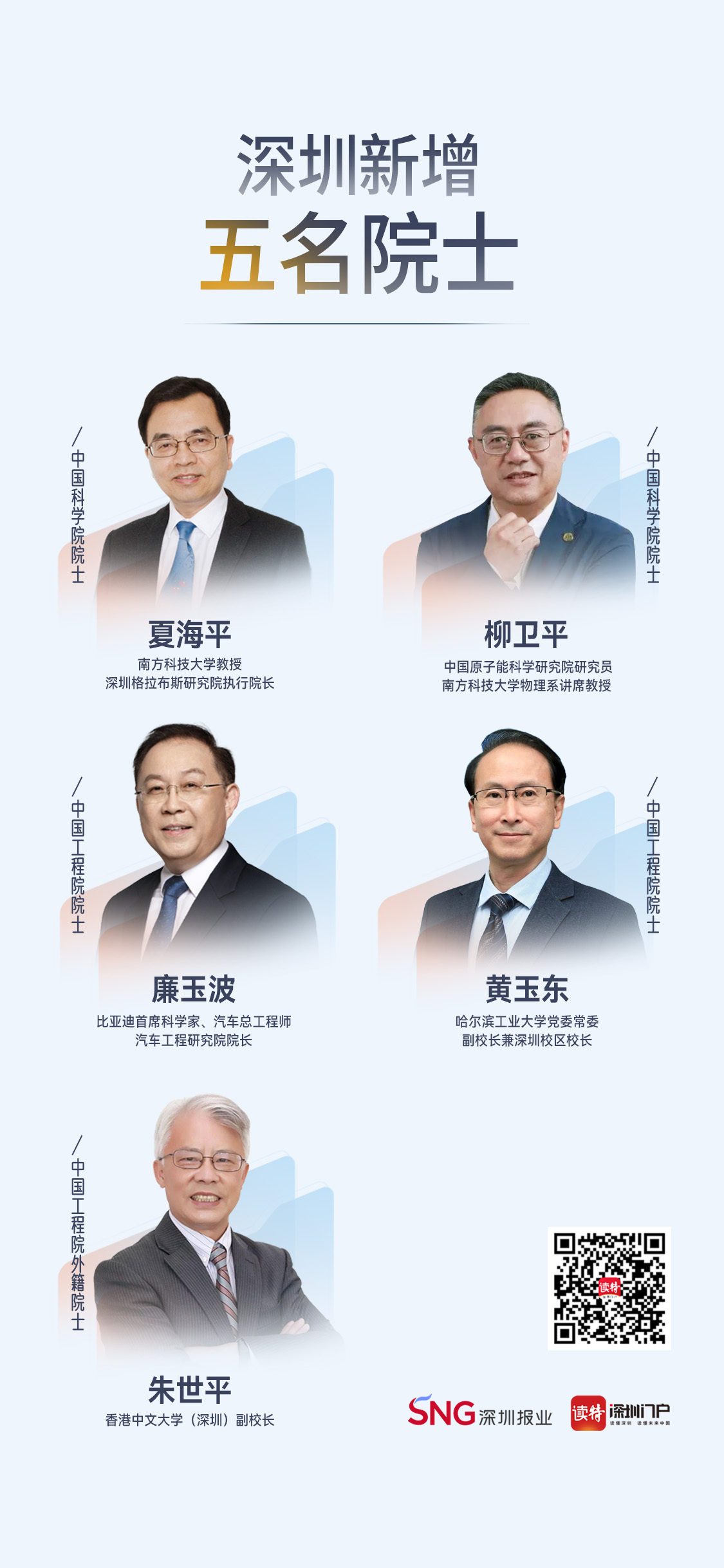 5人中,南方科技大学教授、深圳格拉布斯研究院执行院长夏海平,南科大物理系讲席教授柳卫平当选中国科学院院士;哈尔滨工业大学党委常委、副校长兼深圳校区校长黄玉东、比亚迪首席科学家、总工程师兼研究院院长廉玉波当选中国工程院院士;香港中文大学(深圳)副校长、香港中文大学(深圳)校长学勤讲座教授朱世平当选中国工程院外籍院士。