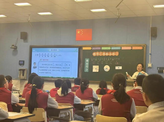“用数与形结合解决复杂问题”,以 “复习回顾 — 深度探究 — 综合应用 — 总结升华” 为脉络,实现 “以数解形” 与 “以形助数” 的双向融合。首先用数学家华罗庚的一首小诗导入新课,激发学习兴趣,接着呈现算式 “1/2 + 1/4 + 1/8 + 1/16”,让学生先计算结果(15/16),再提供圆形纸片、正方形、线段、彩笔,引导学生用 “涂色” 表示算式 。课堂上,常老师以直观的图形演示为依托,引导学生探究分数数列的求和规律。通过“在圆上不断分、不断加”的具象化操作,学生们清晰地感知到:随着分数单位不断细分累加,和会越来越接近1,生动诠释了极限思想的内涵。同时,黑板上“数形结合”和“极限思想”的板块设计,进一步强化了数学思想方法的渗透,帮助学生建立起“以形助数、以数解形”的思维模式。学生们全程专注投入,在观察、思考、讨论中逐步揭开数学规律的面纱,不仅掌握了数列求和的方法,更领悟了数学思想的魅力。