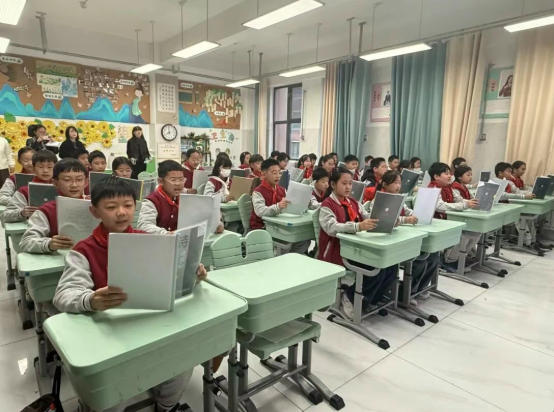 四年级早读注重仪式感与竞技性,每日早读前先“行早读礼”,随后开展拍手读、吟唱、古诗大串烧;互动检测环节,学生通过分角色读、角色扮演读深入理解内容,读完后同桌互查背诵,还设置“小组PK背”“开火车背”,各组比拼背诵速度与准确率,让专注与激情在比拼中迸发。