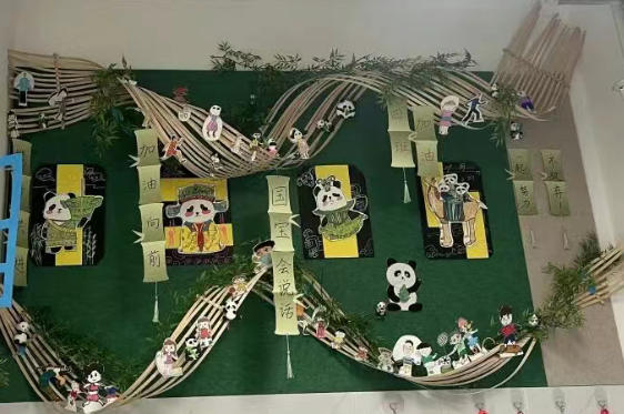 推开门,最先撞进眼里的是满墙的“熊猫元素”:墙角竹栅栏上趴满迷你熊猫玩偶,墙上贴着的熊猫手绘,连班级口号牌都顶着圆滚滚的熊猫耳朵——这只黑白相间的“中国名片”,是我们教室的“萌系主角”。