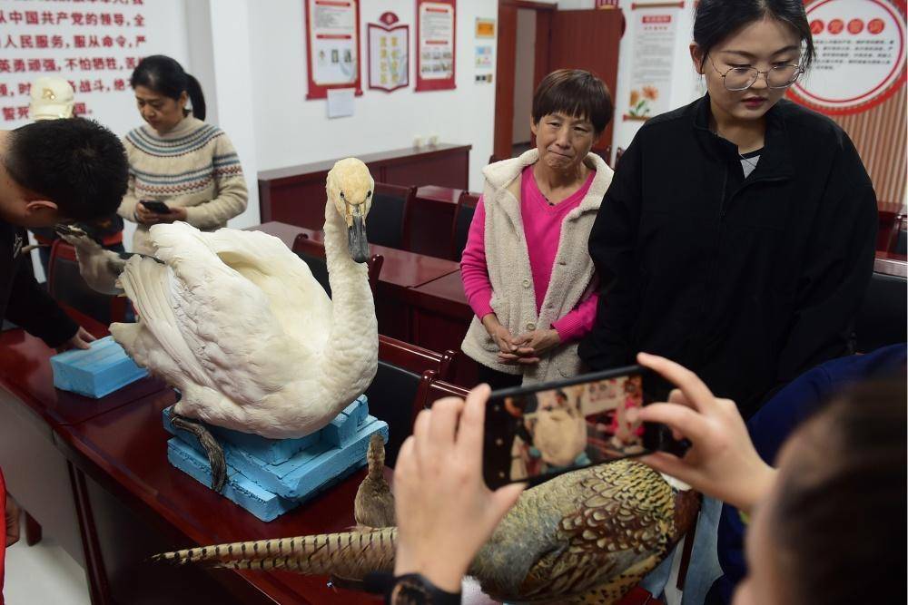 居民在活动现场用手机拍摄天鹅标本。傅新春摄