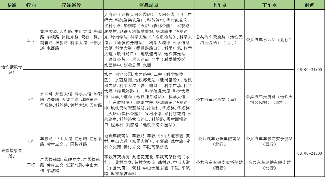 ①逢半点开行大站快车[仅停靠水西站、地铁苏元站(暹岗圣贤)站、科学大道西(地铁神舟路站)、地铁天河智慧城站、天府路(地铁天河公园站)]