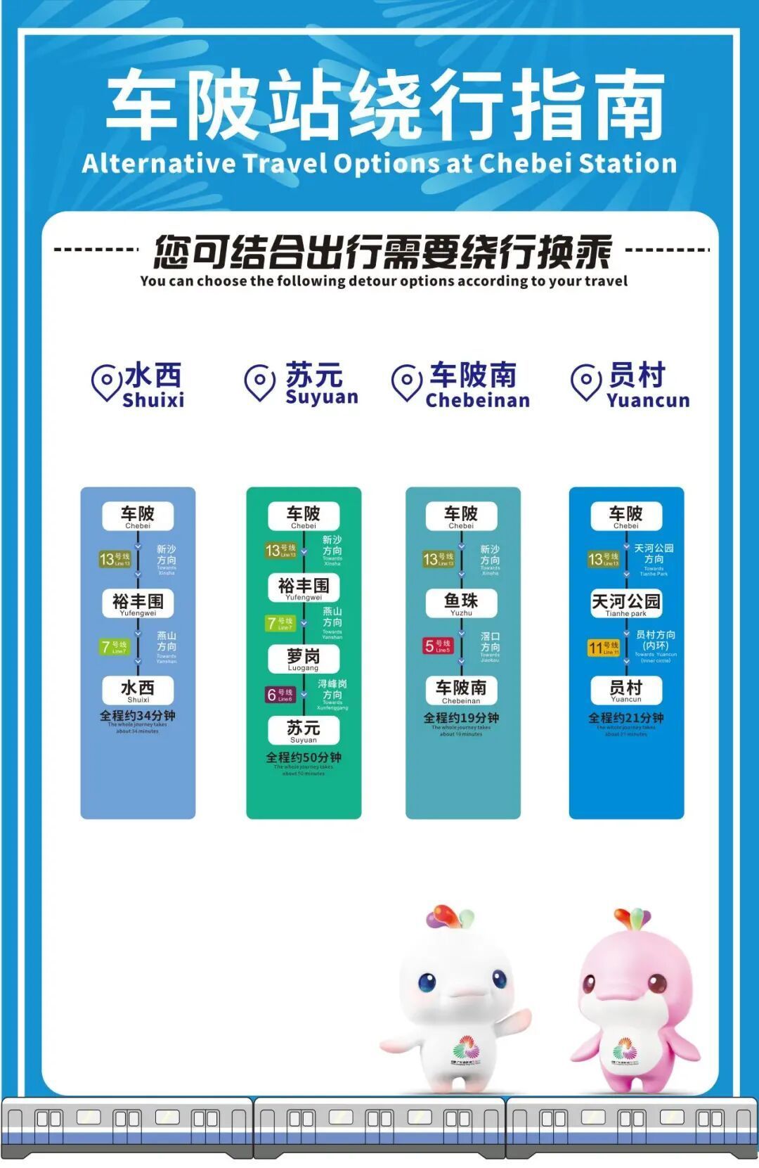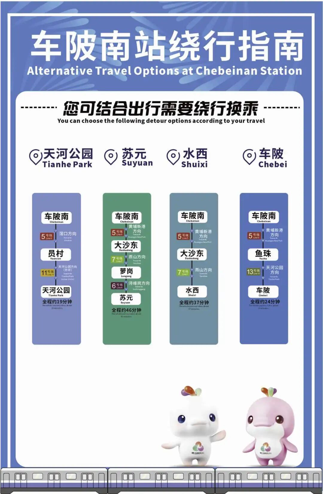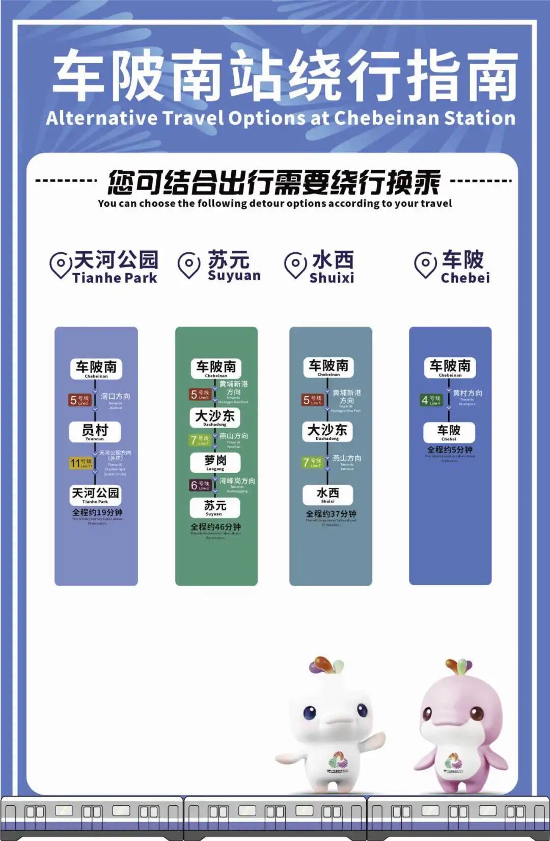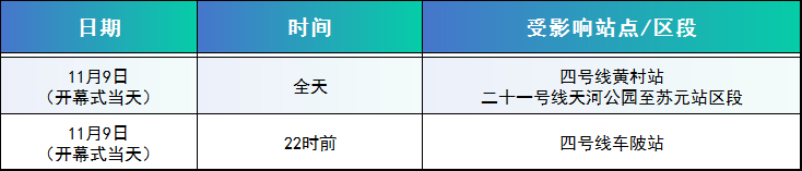 为保障十五运会开幕式疏运工作,11月9日(星期日)开幕式当天,地铁四号线黄村站及二十一号线天河公园至苏元站全天停止对外服务;四号线车陂站22时前停止对外服务,22时后恢复往南沙客运港方向的运营服务。