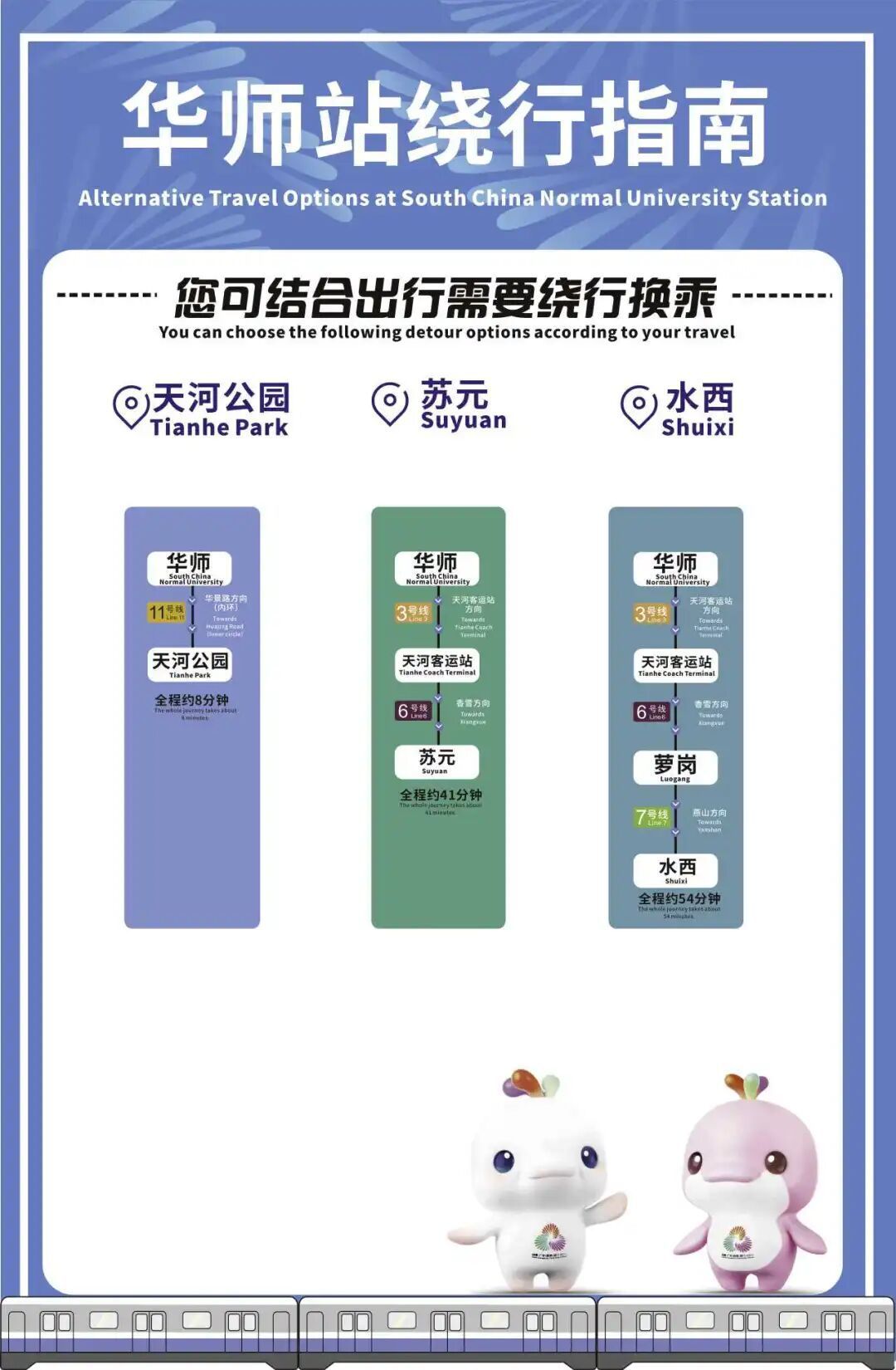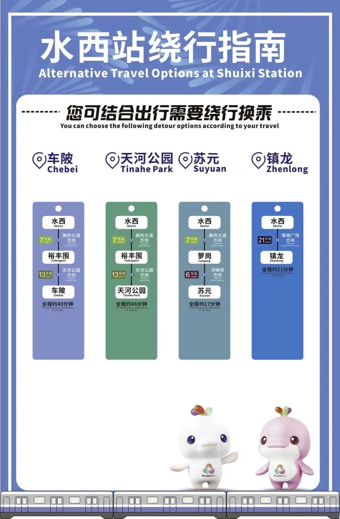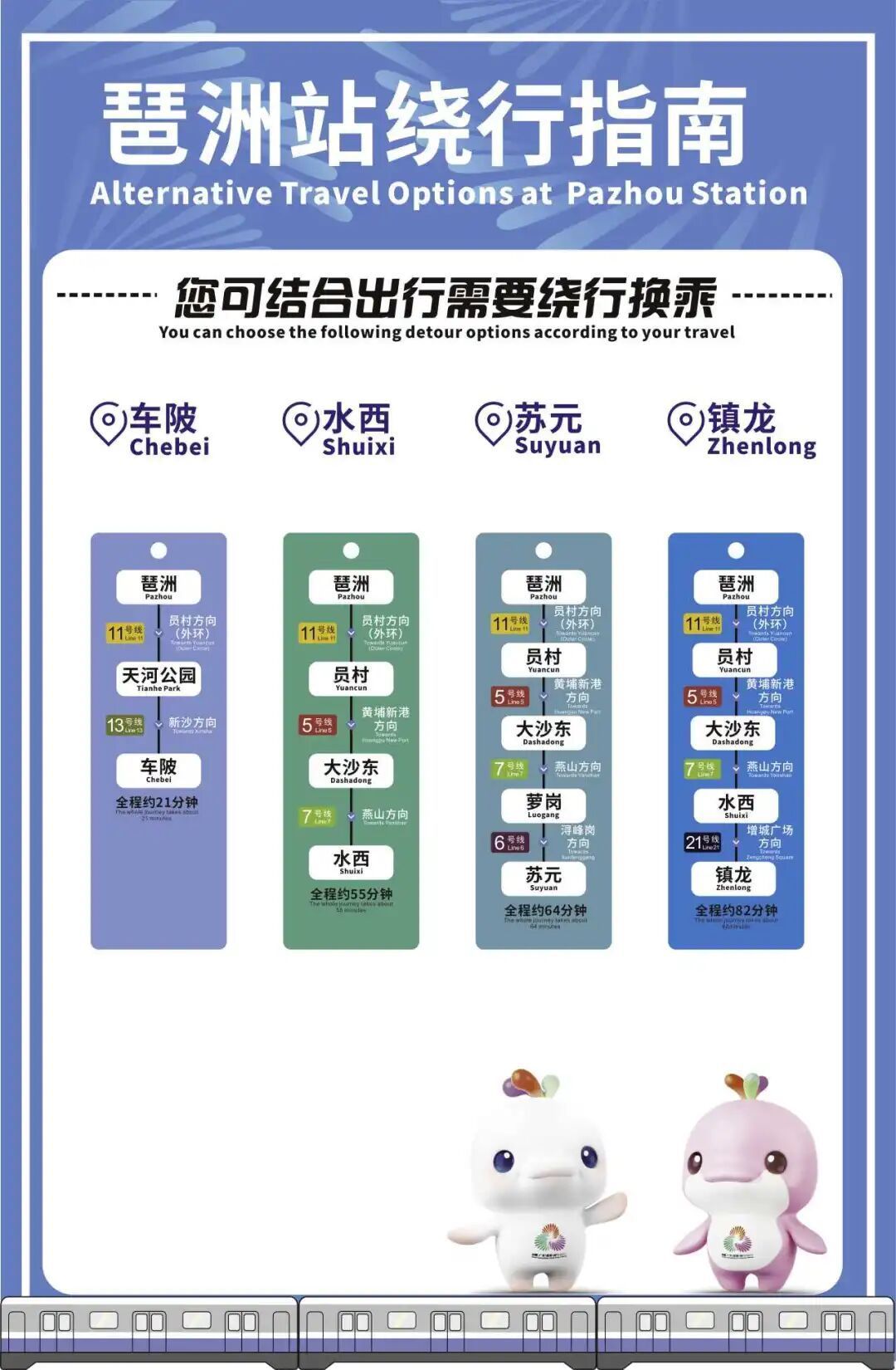 此外,水西、苏元、天河公园、员村、车陂、琶洲、新港东等16个站点还设置“可取走式”绕行换乘指引牌,指引乘客迂回换乘。11月9日,前往广州科技教育城的乘客,可搭乘七号线至水西站换乘二十一号线前往,或搭乘十四号线至镇龙站换乘二十一号线前往;去往广州现代信息工程职业技术学院、私立华联学院、广东岭南现代技师学院(南校区)的乘客可搭乘至十三号线天河珠村站或七号线姬堂站转乘其他交通工具。