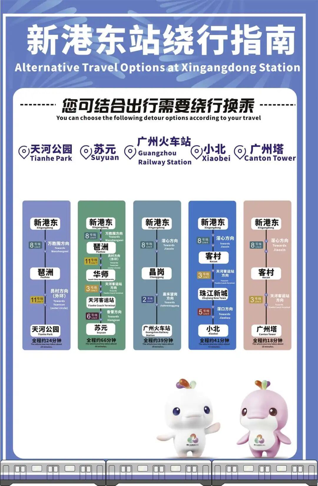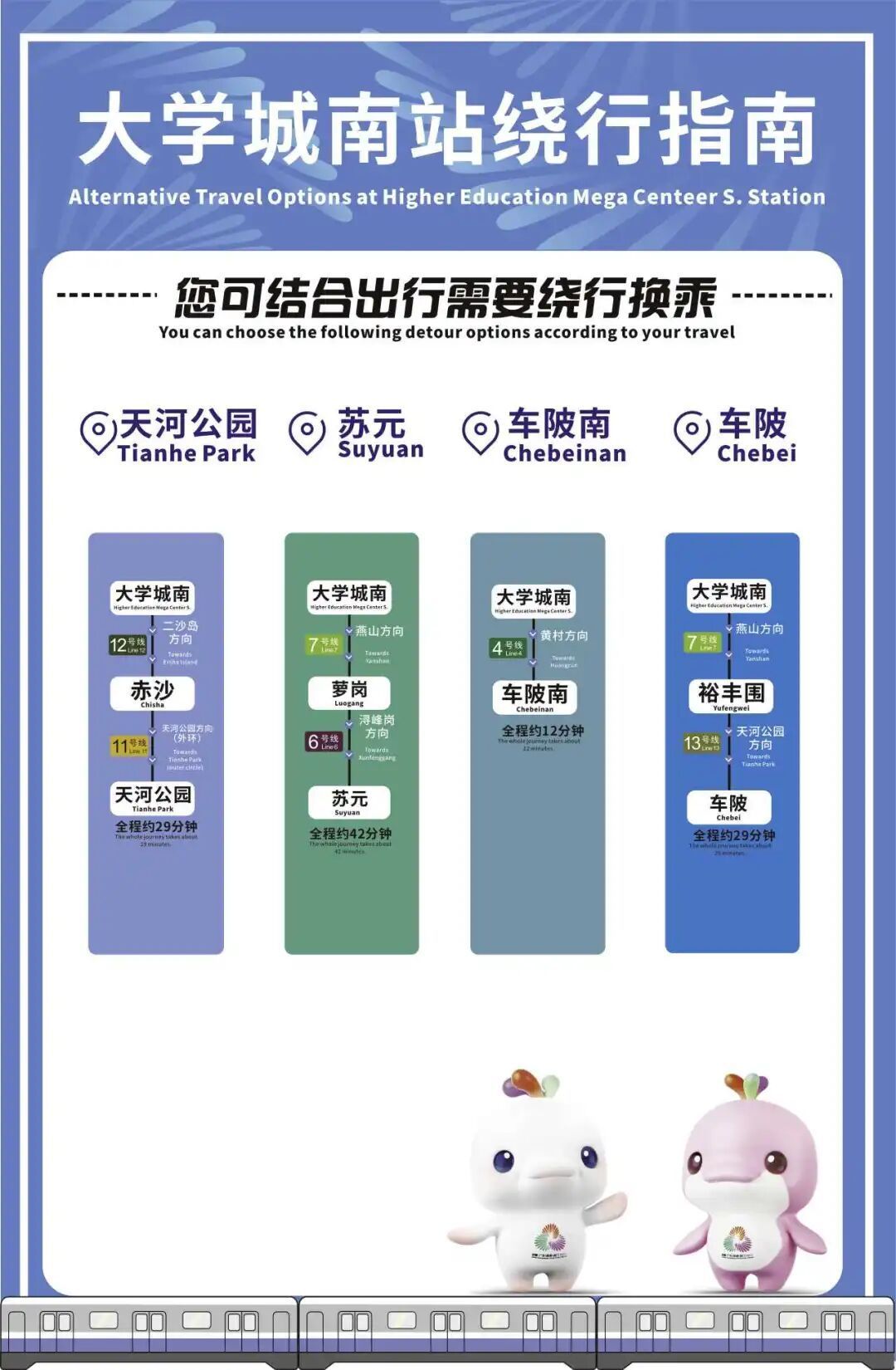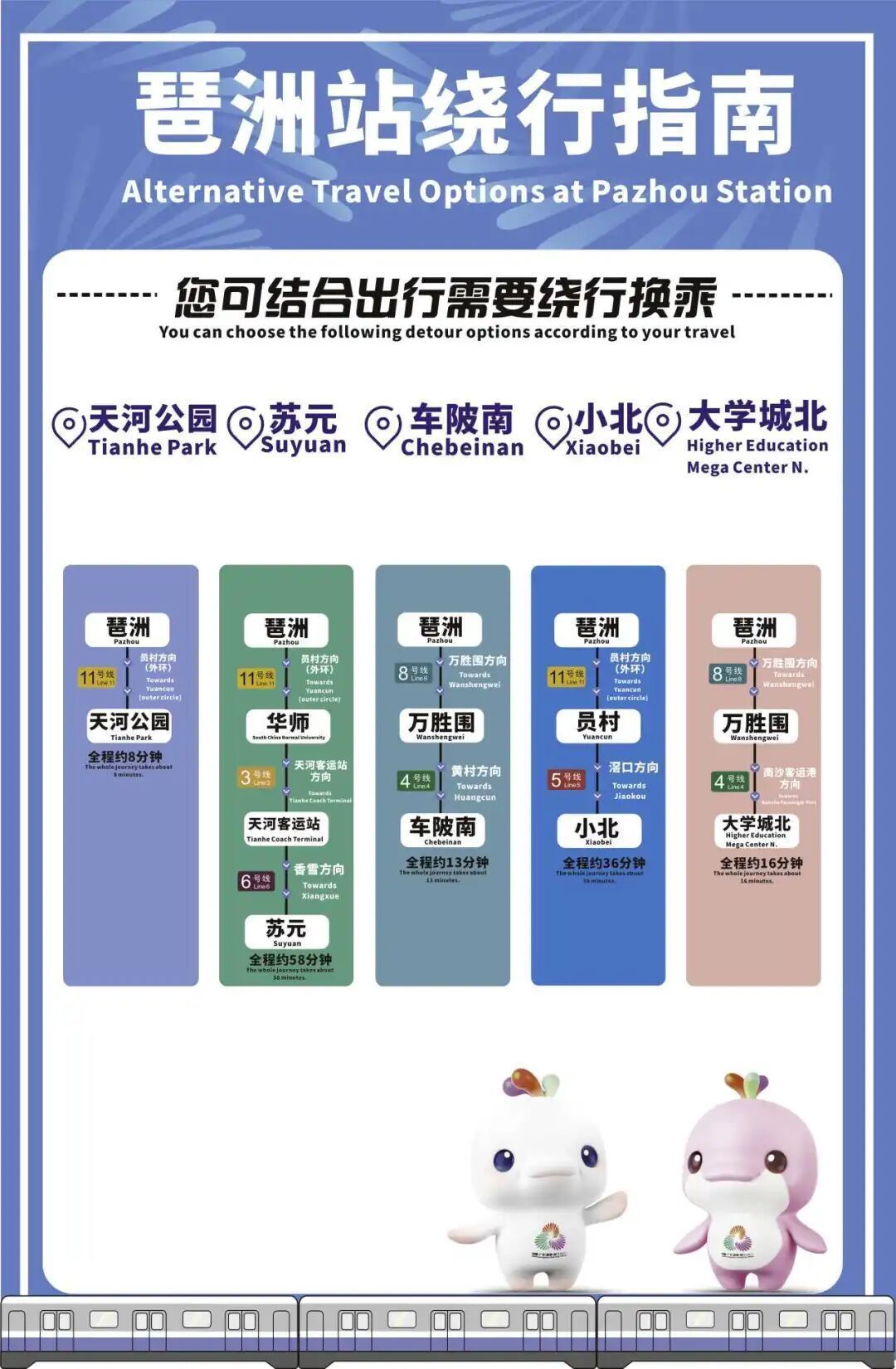 此外,水西、苏元、天河公园、员村、车陂、琶洲、新港东等16个站点还设置“可取走式”绕行换乘指引牌,指引乘客迂回换乘。11月9日,前往广州科技教育城的乘客,可搭乘七号线至水西站换乘二十一号线前往,或搭乘十四号线至镇龙站换乘二十一号线前往;去往广州现代信息工程职业技术学院、私立华联学院、广东岭南现代技师学院(南校区)的乘客可搭乘至十三号线天河珠村站或七号线姬堂站转乘其他交通工具。