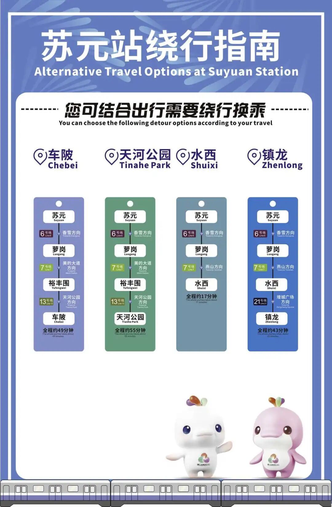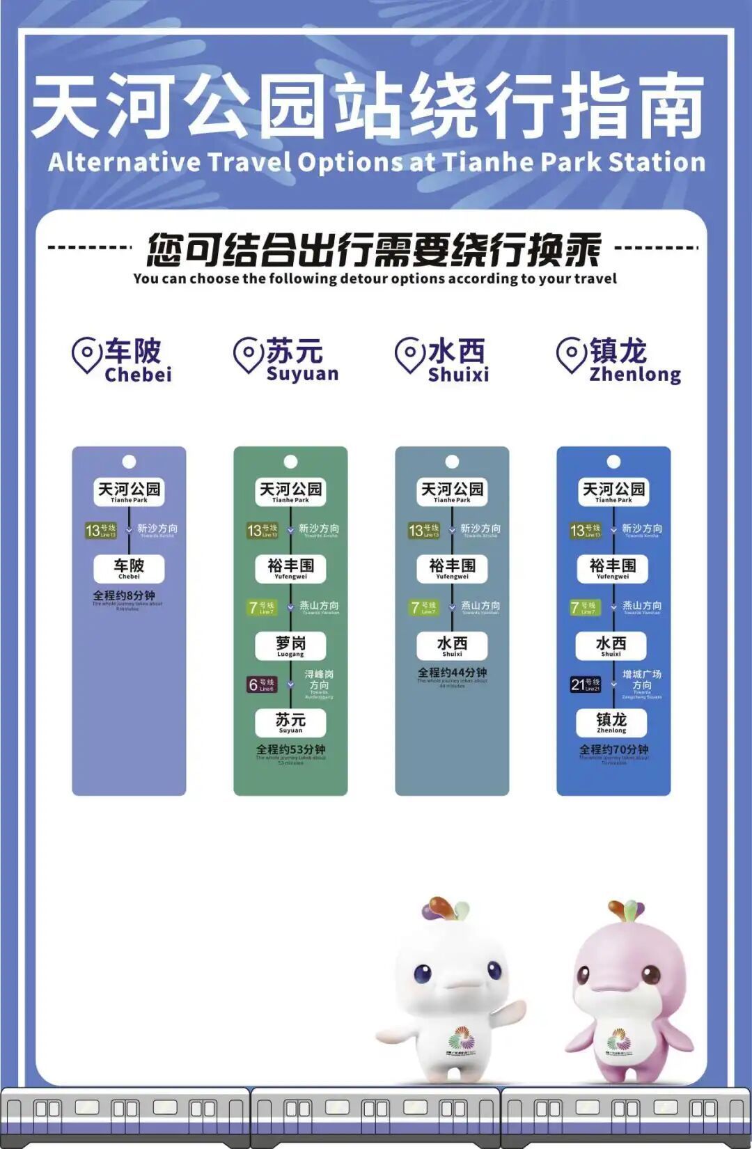 二十一号线天河公园、苏元站停止对外服务期间,因车站部分出入口通道、站厅、站台等区域将实施围蔽,十一、十三号线天河公园站及六号线苏元站无法换乘二十一号线。同时,二十一号线水西至增城广场区段正常运营,全天开行普通车。